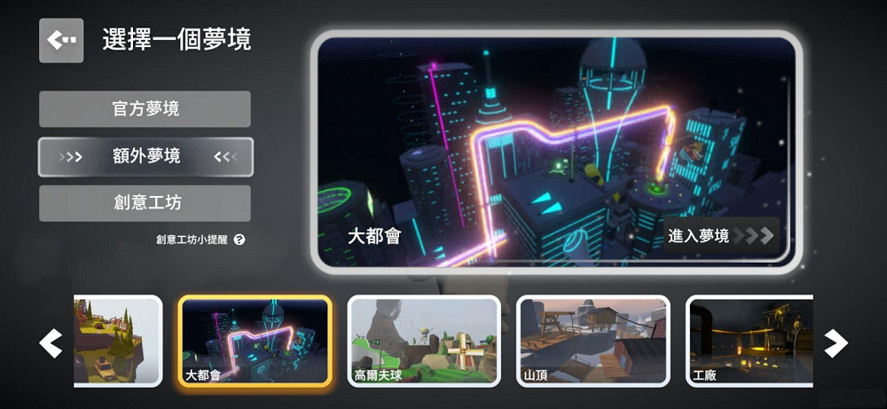 《人類跌落夢境》現在包含了 12 個官方關卡、9 個額外關卡和 7 個創意關卡,官方也会持續將玩家們制作的地圖手動移植至手機版內,玩家可以在不斷更新及持續移植的玩家自製內容中與好友同享全新體驗。每個玩家制作的關卡都會提供一個全新的環境讓玩家探索,從豪宅、城堡和阿茲特克到雪山、光怪陸離的夜景和工業區、再到環境險惡的巖石之地。