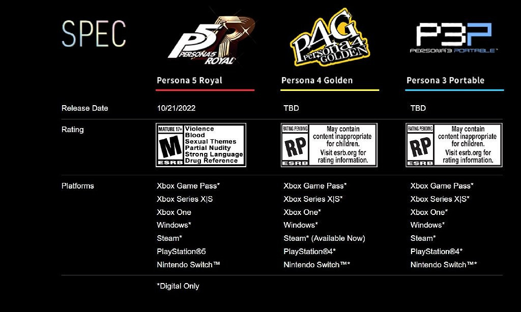此前,本月早些時候,Atlus宣布《女神異聞錄5:皇家版》《女神異聞錄4:黃金版》和《女神異聞錄3:攜帶版》將登陸Xbox Game Pass,Xbox,PS5(PS4),Windows和Steam平台,支援中文。