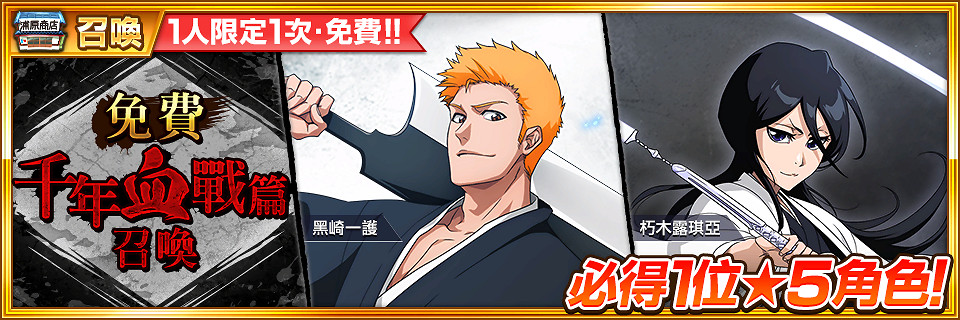 必得1位★5千年血戰篇角色,而且每人限定召喚1次,千萬別錯過這個特別的召喚!
