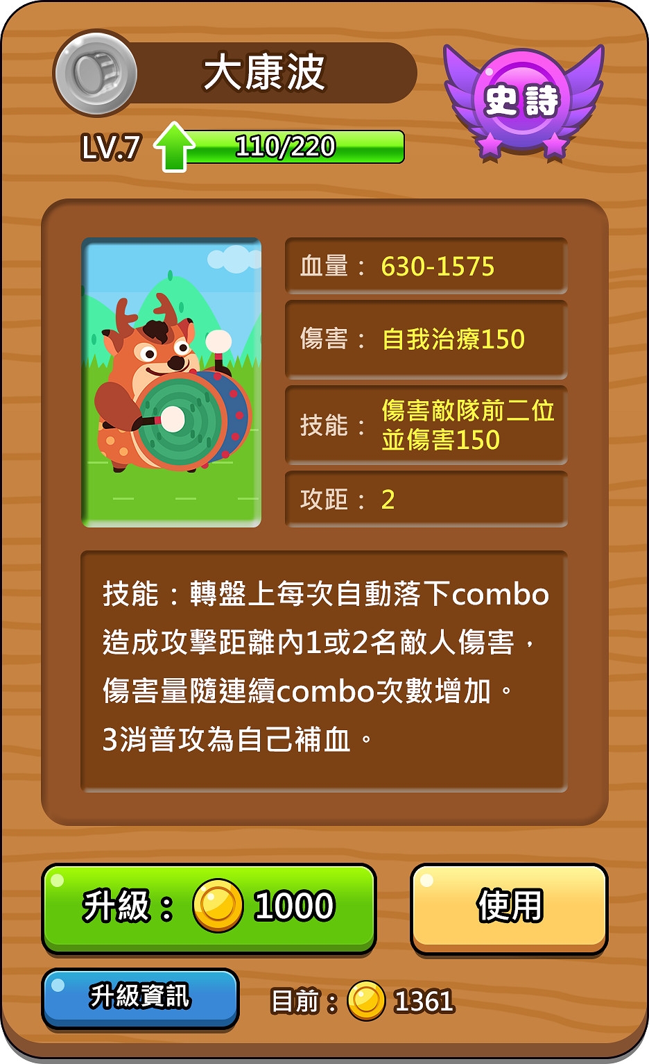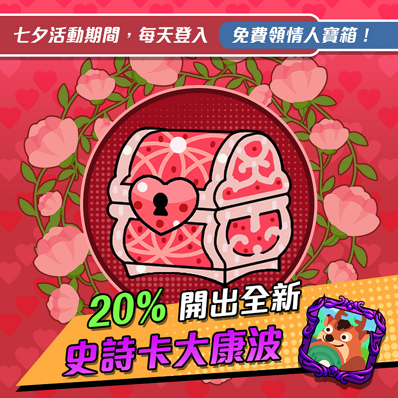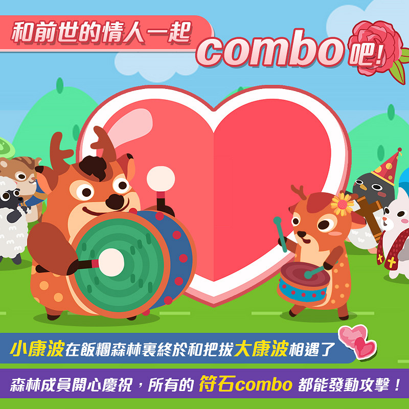 飯糰森林的級新成員『小康波』終於不再孤軍奮戰,就在七夕之際,小康波在終於和把拔『大康波』相遇了!史詩級『大康波』變身為勇猛的近戰,將對敵方排頭造成大量傷害,三消時還能自我補血、前方倒坦也不怕!大小康波聯手將大幅強化combo的威力,玩家想製造更多的combo數量,可多利用彩虹寶石及優先消除下方的轉珠來提高幾率,快來戰場召喚多隻大小康波一起combo吧!除了全新卡版,『飯糰傳說』在7/30至8/9 推出七夕活動,玩家在活動期間每天登入即可領取情人寶箱,除了有2.5%機率開出傳奇卡,還有20%開出全新史詩卡『大康波』!