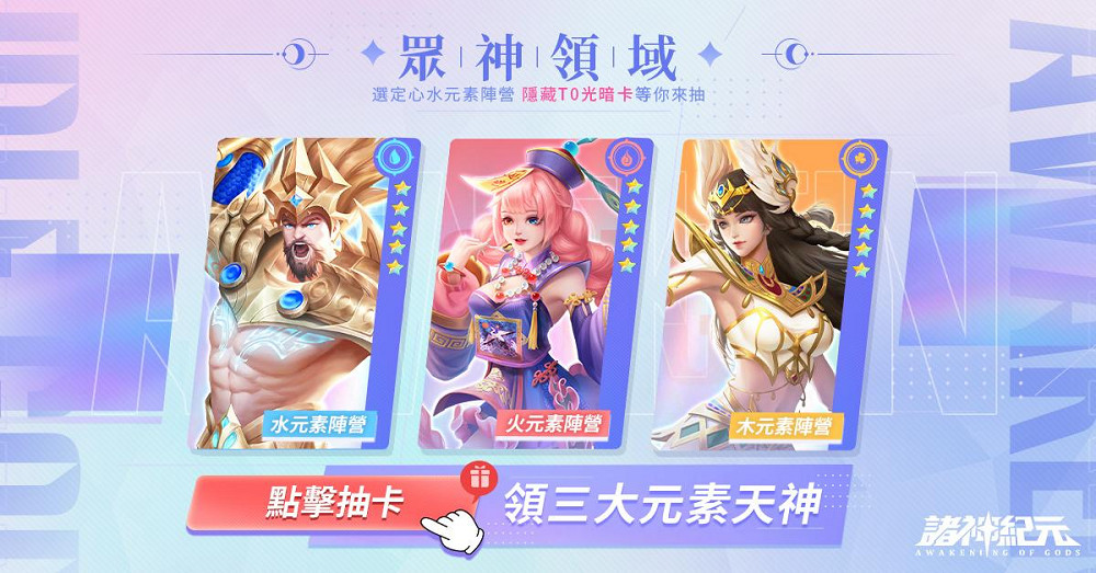 現在完成預約,即送台港澳限定天神「媽祖」,憑天后之靈捍衛新紀元的安寧!玩家還能參與「眾神領域」活動,召喚三大元素陣營的S級天神。