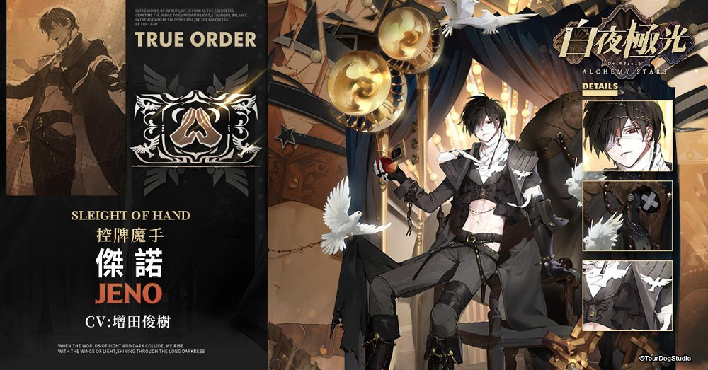 6 星,屬性森,稱號控牌魔手;傑諾在很小的時候第一次進入綠榴石號馬戲航船,就被老團長的魔術深深吸引。老團長感受到了傑諾的身上的藝術天賦,將他收為徒弟。傑諾長大後,曾前往大陸遊歷學習,再回到綠榴石號時從年邁老團長手中接管了馬戲團。