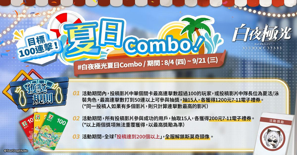 在這炎炎夏日裡,《白夜極光》官方粉絲團舉辦了火辣的夏日combo活動,導航員只要將戰鬥畫面上傳並投稿,就有機會獲得 200 元 7-11 電子禮券,戰鬥達成指定連擊數也有機會獲得實體獎勵 1,200 元 7-11 電子禮券,此外投稿達成指定數量還可解鎖「斯莫奇」頭像,導航員快手刀參加活動拿獎勵吧!想要知道更多關於《白夜極光》遊戲消息請密切關注官方粉絲團的資訊喔!