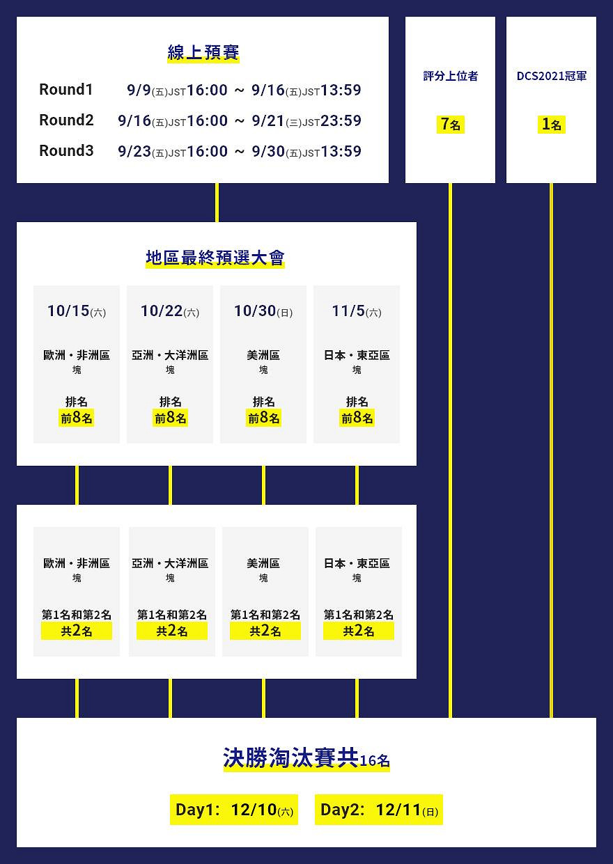 ※ 本次大賽遊戲內新設置了評分的決賽淘汰賽名額,因此最終地區預賽為4個區域。與此同時,從線上預賽晉級至最終地區預選大賽的名額也有所變動,詳細內容還請至官方網站確認。