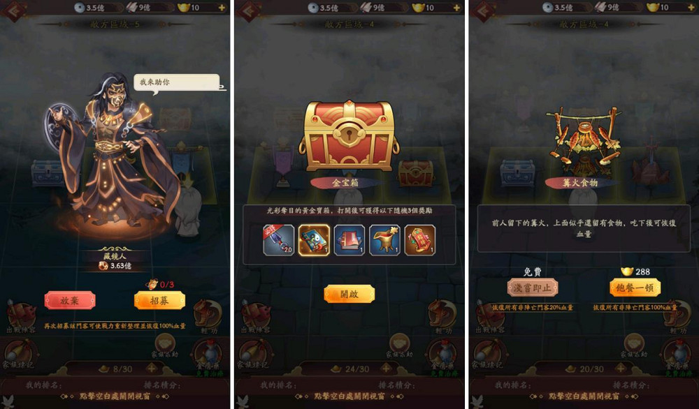 篝火食物事件:消耗元寶可恢復所有未陣亡門客血量。