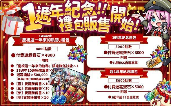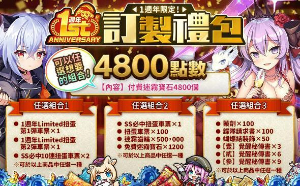 ‧活動內容:附贈限定隊伍技能、SS必中10連扭蛋車票、迷霧寶石等超值道具的紀念優惠禮包!