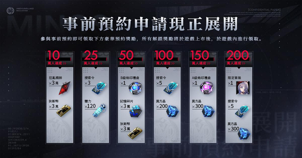 即日起凡依照事前登錄頁面說明完成事前預約的玩家,即可在遊戲上市時獲得虛寶獎勵。隨著全球預約人數增加,將可逐步解鎖更加豐富的預約獎勵內容,其中包括事前預約限定的禁閉者「赫卡蒂」專屬套裝與能讓玩家能進行獲取角色的「搜索令」等。