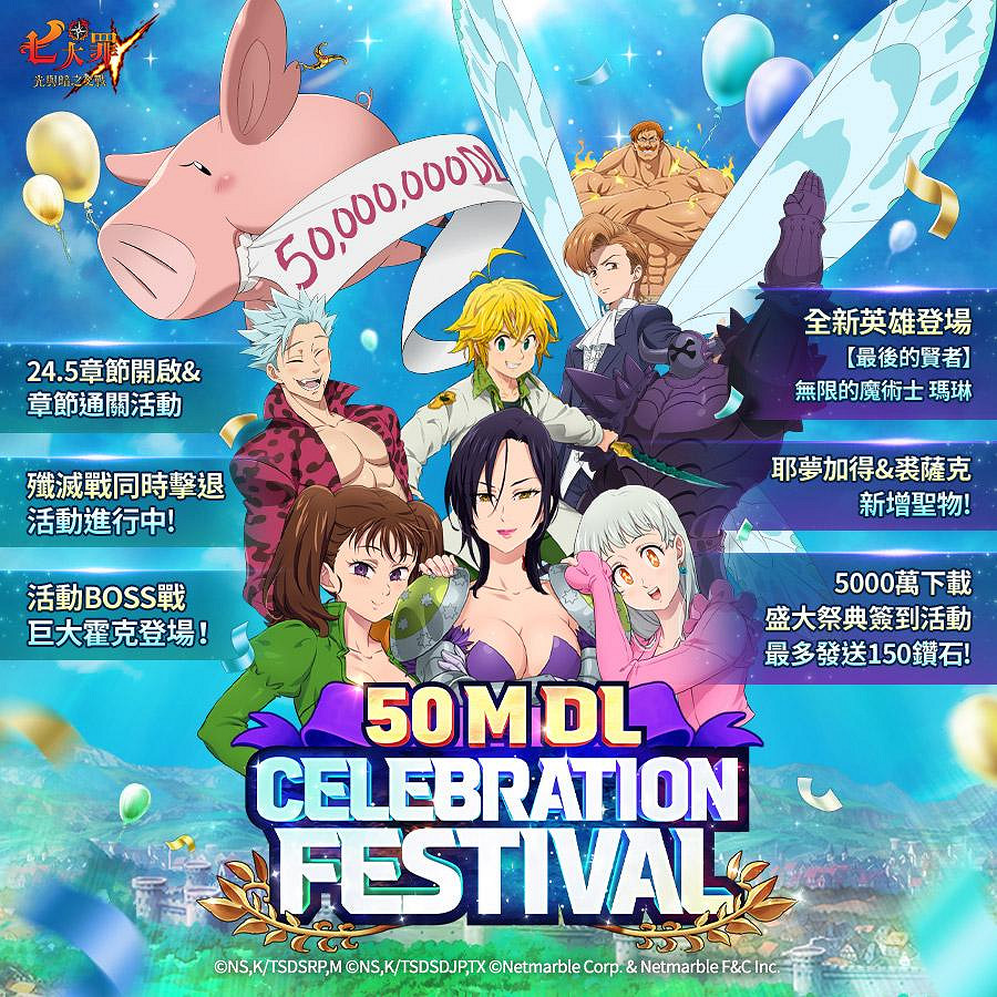 身為全球領先、高品質手機遊戲開發與發行公司的網石集團(Netmarble Corporation)歡慶旗下如電影般的冒險RPG手遊七大罪:光與暗之交戰,下載量達5000萬次!遊戲內舉辦5000萬下載盛大祭典,為粉絲們推出全新英雄、特別活動與獎勵等內容。