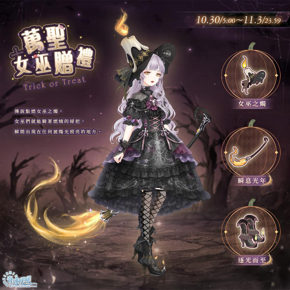 「萬聖女巫贈禮」活動自30日起至11月3日限時開啟。活動期間內,搭配師登入遊戲即可透過信箱內信件領取「萬聖女巫贈禮」,內含散件「女巫之燭」、「瞬息光年」與「逐光而至」,提醒搭配師們記得登入遊戲並前往信箱領取!