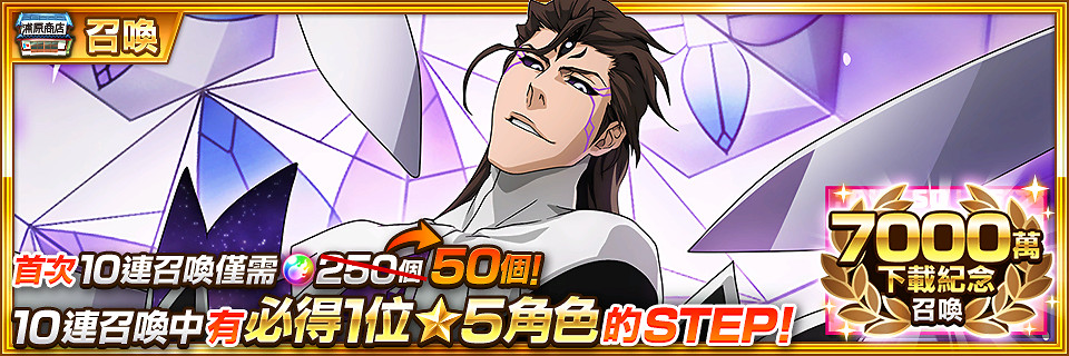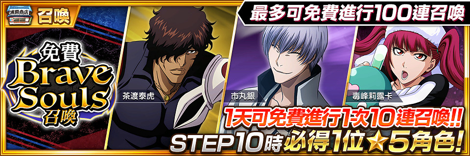 活動期間內1天可免費進行1次10連召喚,最多可免費進行100連的召喚登場! STEP10時必定出現1位★5角色!!