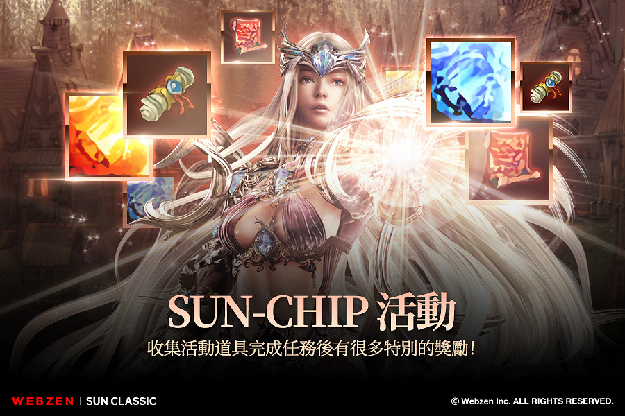 即日起至17日,為期二週期間,擊殺「冰風谷」和「魔族城堡」地圖的「普通~首領怪」後有機會獲得活動道具「SUN-CHIP」。而且,進入每天可挑戰2次的故事副本,從「火龍谷」通關至「魔族城堡」也可以獲得活動道具。依據收集的 SUN CHIP 數量,完成小鎮內伊瑟林NPC[收藏家魯米爾]的活動任務後,可以獲得6階精英或稀有品質裝備等道具獎勵。