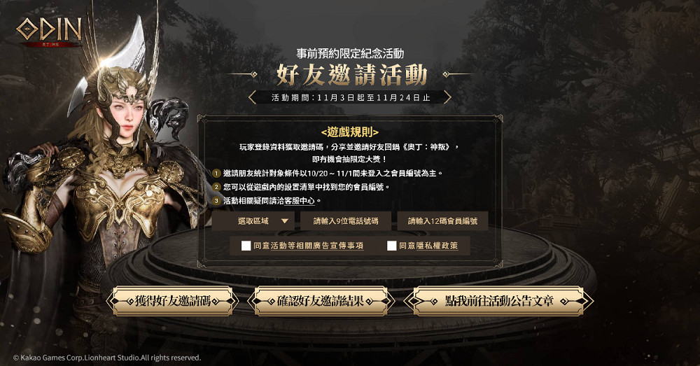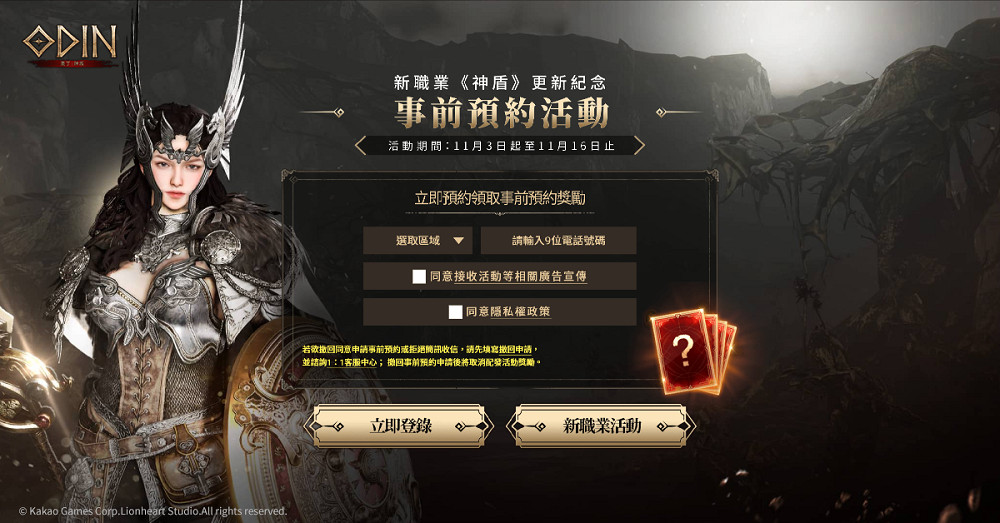 由韓國遊戲公司Kakao Games發行及其營運合作夥伴 Glohow在台營運、LionHeart Studio研發團隊打造的跨平台MMORPG遊戲大作 《奧丁:神叛》於11月3日(四)宣布新職業《神盾》事前預約網頁正式開啟,玩家可從今日至11月16日(三),為期2週的時間於事前預約網頁中進行預約。(立即前往事前預約:https://bit.ly/PreOdinNov_PR)