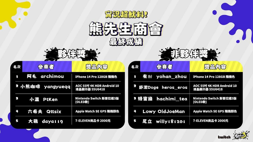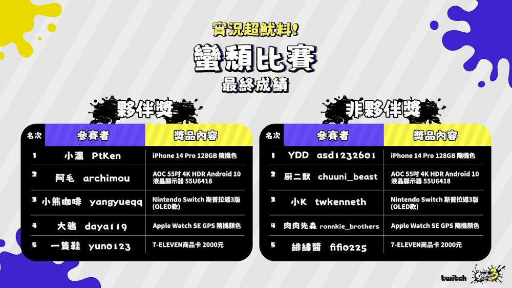 Twitch 實況超魷料!《斯普拉遁 3》挑戰賽賽程長達兩周,期間內共有蠻頹挑戰與熊先生商會兩種模式供參賽者選擇累積積分的目標,在參賽期間內獲得最高積分的實況者們將奪得包含 iPhone 14、AOC 55 吋 4K HDR Android 液晶顯示器、Nintendo Switch《斯普拉遁 3》版本與 Apple Watch 等超豪華獎勵。