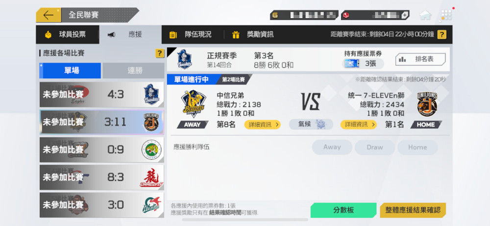玩家可透過應援票券進行賽果預測。(實際以遊戲內活動獎勵為準)