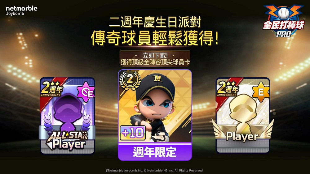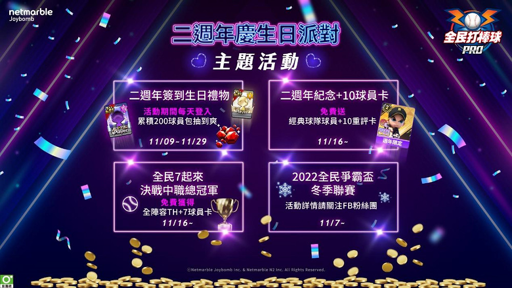 為了慶祝上市2週年,《全民打棒球Pro》開啟眾多週年福利活動,自11月9日至29日止,遊戲內推出「2週年生日禮物」,玩家登入遊戲即可獲得200抽的「2週年紀念卡包」,透過累積「2週年紀念卡包」,還可於活動期間升級兌換「2週年紀念傳奇卡包E」。