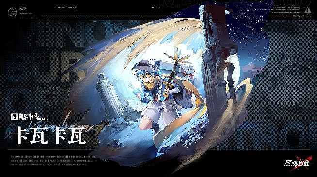 A級禁閉者——卡瓦卡瓦是名擁有樂觀善良天性的奇怪少年,作為砂海的嚮導,他每日都在對茫茫無際的砂海進行繪測。屬於堅韌特化類型的他,隨身攜帶的信標,能夠變成小型庇護所,為身邊的人帶來保護,大招【守護信標】可於單場戰鬥結束前,為我方指定單一友軍帶來,每2秒恢復1%最大生命值的持續性補給。