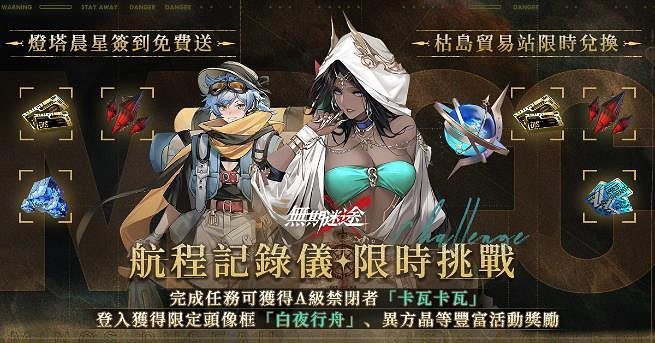 活動期間內將開放「越軌航道」、「沉戟之戰」等限時挑戰關卡,玩家只要通關主線Re:1-9「與彼岸重逢」,即可參與活動副本。本次副本關卡將可以體驗「怒海狂砂」版本的專屬故事情節,了解砂海上爭搶資源背後不為人知的故事。此外,更可於「航程記錄儀」活動中獲得全新角色「卡瓦卡瓦」、活動限定頭像框「白夜行舟」、「意識晶核」*1、「異方晶」*180等豐富虛寶。