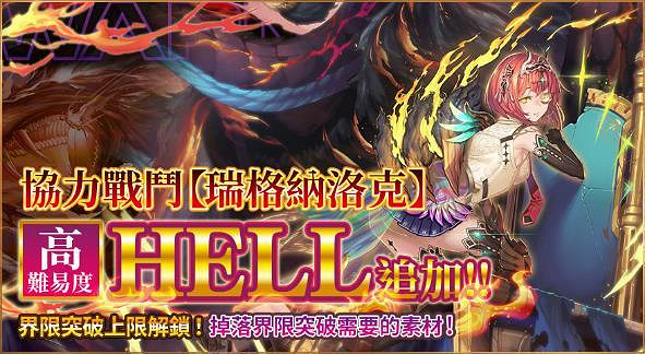協力戰的戰鬥新難度『HELL』實裝!隨著難度再提升,戰神「瑞格納洛克」也將開放第5階段的界限突破。必須在「瑞格納洛克HELL」獲取解鎖第5階段所需的界限突破素材,請一定要來挑戰哦!
