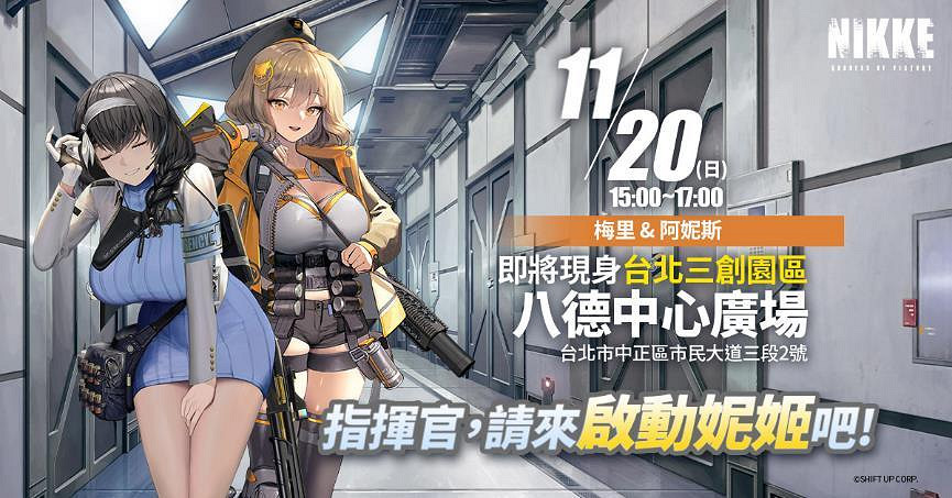 《勝利女神:妮姬》首場「指揮官,請來啟動妮姬吧!」已圓滿結束 ,第二場活動 - 「泰特拉場」將在11/20(日) 下午15:00 ~ 17:00於三創園區-八德中心廣場登場,該場將有知名Coser扮演妮基「梅里」及「阿妮斯」與玩家近距離互動及拍照,精美大型睡艙場景也將移師現場,喜愛《勝利女神:妮姬》的玩家們記得把握機會前往參加同樂,千萬不能錯過,妮姬將在現場等你喔!