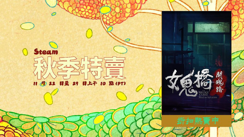 《女鬼橋 開魂路》將在STEAM秋季特賣期間(Autumn Sale):太平洋時間11月22日10:00AM ~ 11月29日10:00AM (也就是台灣時間約為11月23日02:00AM ~ 11月30日02:00AM),再次推出85折優惠!還在觀望的玩家,一定要把握這個入秋以來的首次折扣!