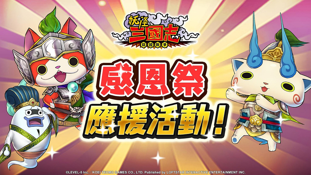 由LEVEL-5與KOEI TECMO Games雙大廠聯手打造,大宇資訊旗下星宇互動娛樂代理的Q萌策略遊戲《妖怪三國志 竊國戰爭》,本作承襲了KOEI知名系列作品《三國志》經典的調兵遣將,組派軍隊攻城/守城,亦或是主持內政的策略玩法,並結合《妖怪手錶》中個性鮮明生動的可愛妖怪,所展開的夢幻合作企劃。日前《妖怪三國志 竊國戰爭》官方宣佈,為迎接一年一度的感恩節到來,營運團隊懷抱著感謝玩家的心情,將回饋各式感恩特典給各位玩家,不論是萌新入坑抑或是老手回歸,都將獲得專屬好禮!