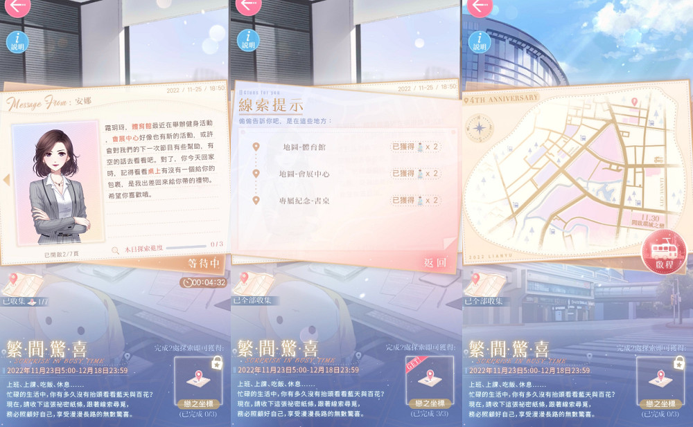 當玩家集齊一定數量的驚喜獎勵並領取「戀之坐標」後,將開啟下一位NPC的提示,先前尚未找齊的探索地點亦會保留,玩家可繼續尋找。一旦收集全部7枚「戀之坐標」即可合成「神祕地圖」,正式開啟週年探索。