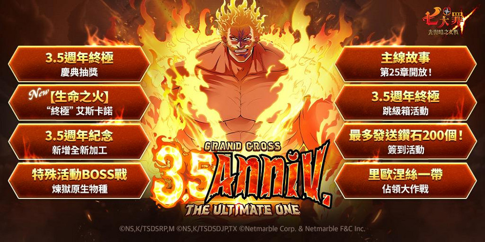 身為全球領先、高品質手機遊戲開發與發行公司的網石集團(Netmarble Corporation)宣布,為紀念如電影般的冒險RPG手遊七大罪:光與暗之交戰,迎來3.5週年,推出「Grand Cross 3.5週年終極慶典」遊戲更新。玩家可體驗全新英雄角色與眾多遊戲內活動等豐富內容。