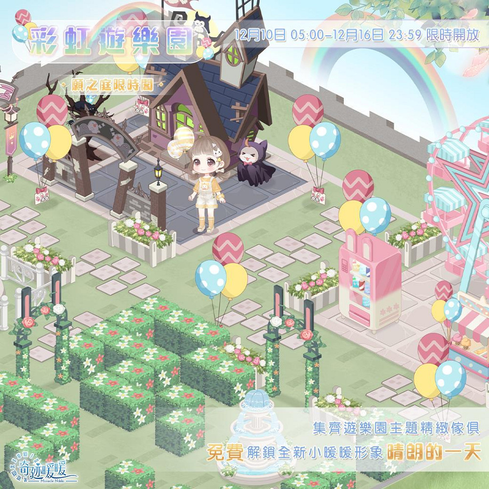 在12月10日至12月16日的活動期間內,搭配師前往小屋願之庭的限時抽獎閣「彩虹遊樂園」許願,即可獲得遊樂園主題傢俱。集齊所有限定傢俱還可領取全新小暖暖形象「晴朗的一天」。