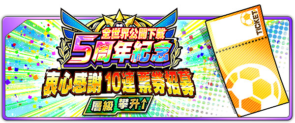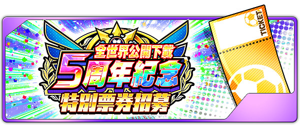 將舉辦可使用「全世界公開下載5週年紀念 選擇式 SSR 確定票券」的招募活動。玩家可從10名登場的球員中選擇並獲得1名球員,夢幻祭典、夢幻精選、NEXT DREAM 限定選手也將會登場。