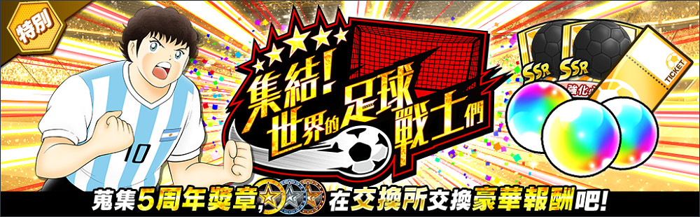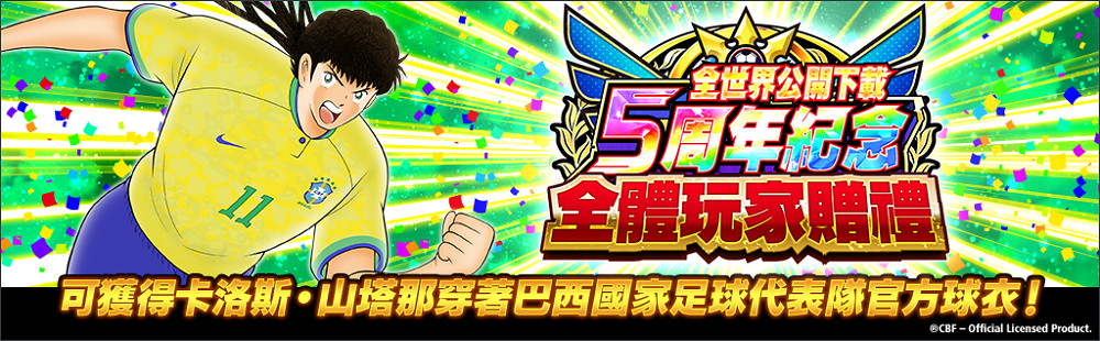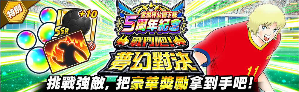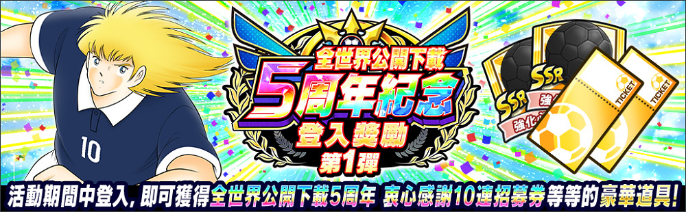 KLab株式會社(本社:東京都港区、代表取締役社長:森田英克、以下「KLab」)旗下對戰型足球模擬遊戲《足球小將翼:夢幻隊伍》,宣布於遊戲內舉辦「全世界公開下載5週年紀念活動」,玩家可從「全世界公開下載5週年紀念全體玩家獎勵」和「全世界公開下載5週年紀念感恩好禮」等活動獲得各種道具和球員。