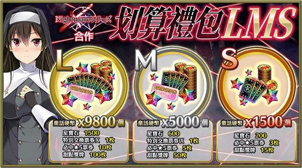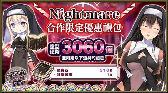 █ 活動內容:《Nightmare系列》合作紀念,推出包括裝有童話硬幣以及星寶石等豪華遊戲道具的3款特別禮包。