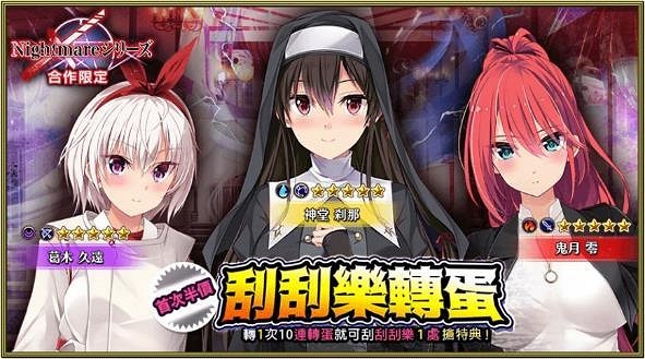 █ 活動內容:可以抽取《Nightmare系列》人氣角色「★5神堂 刹那」「★5葛木 久遠」「★5鬼月 零」的轉蛋。