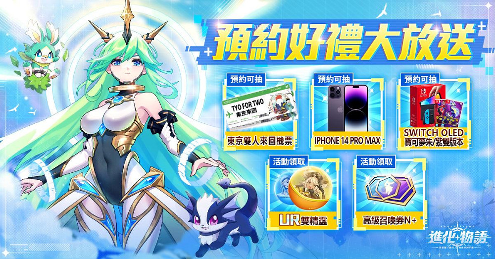 《進化物語》事前登錄活動除了可以獲得兩隻UR精靈,還有高級召喚券及海量虛寶,助力玩家完美開局!邀請好友共同完成預約人數達成任務,即可解鎖豪華實體獎品抽獎,東京雙人來回機票、iPhone 14 Pro Max、Nintendo Switch OLED配寶可夢朱/紫雙版本等你來領!更多遊戲資訊和官方福利請追蹤《進化物語》官方粉絲專頁,小編喵醬逐一奉上!