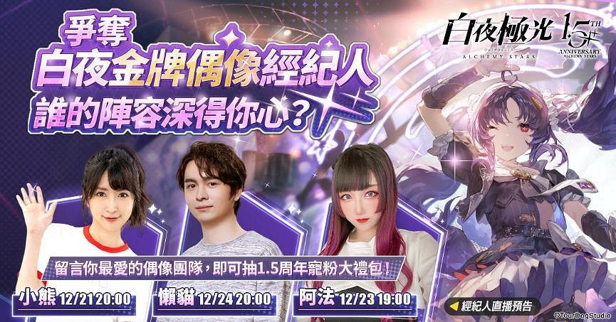 另外,《白夜極光》也將於12月22日起,邀請知名KOL懶貓、小熊、阿法參與「白夜金牌偶像經紀人」系列直播活動,看看誰的偶像團體最合你心意!此外《白夜極光》也參與了Game Star 遊戲之星2022票選活動,於12月13日起,只要參與線上投票就有機會獲得遊戲實體周邊獎勵,各位導航員千萬不要錯過!想瞭解更多《白夜極光》相關資訊,請密切關注官方粉絲團!