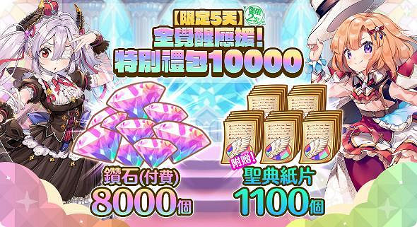 █ 活動內容:可獲得高達8,000個鑽石(付費)外加1,100枚聖典紙片的5日限定特別禮包!