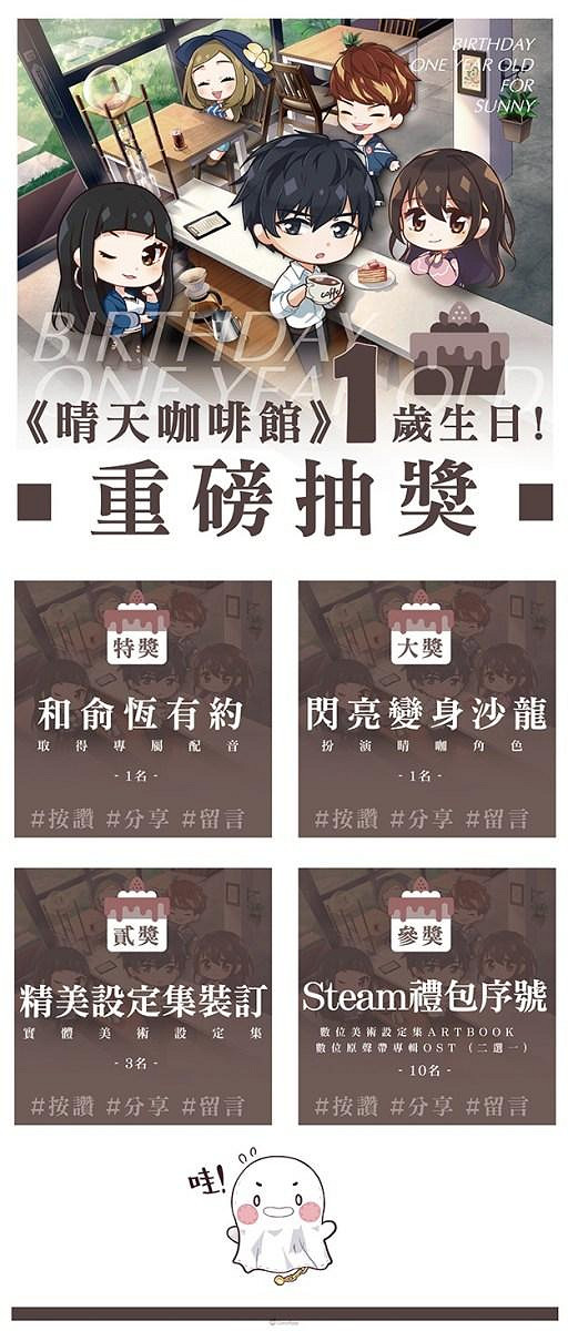 即日起~12/31玩家僅需完成《晴天咖啡館》粉絲團所公開的任務,即可參加抽獎。本次週年抽獎活動的獎品中,最引人注目的非屬「特別奨:與俞恆有約」,遊戲貴族特別邀請為《晴天咖啡館》吳俞恆 配音的知名聲優 VI 音箱為大獎獻聲,只要抽中大獎,即可讓知名聲優 VI 音箱為你錄製專屬於你的語音哦!