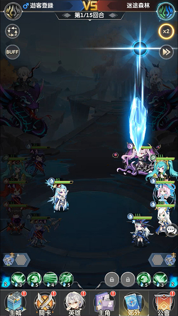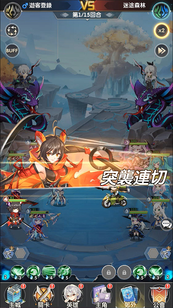 圖中展示了雙刃的範圍攻擊技能「突襲連切」,三道火焰劍氣對敵人中間三行角色造成傷害;還有雪狼從天召喚冰錐的「生命凍結」,對全體敵人造成傷害並有一定機率疊加無法動彈的冰凍效果。每隻精靈都有自己的專屬技能展示,充分體現精靈精美的live 2d立繪、技能名字、技能特效和多角色動作反應,讓冒險家能很好地觀賞精靈少女的戰鬥。