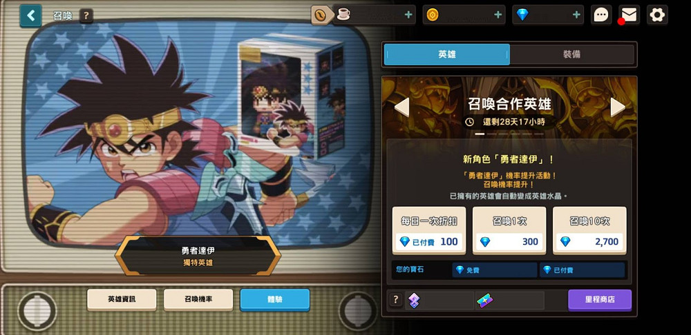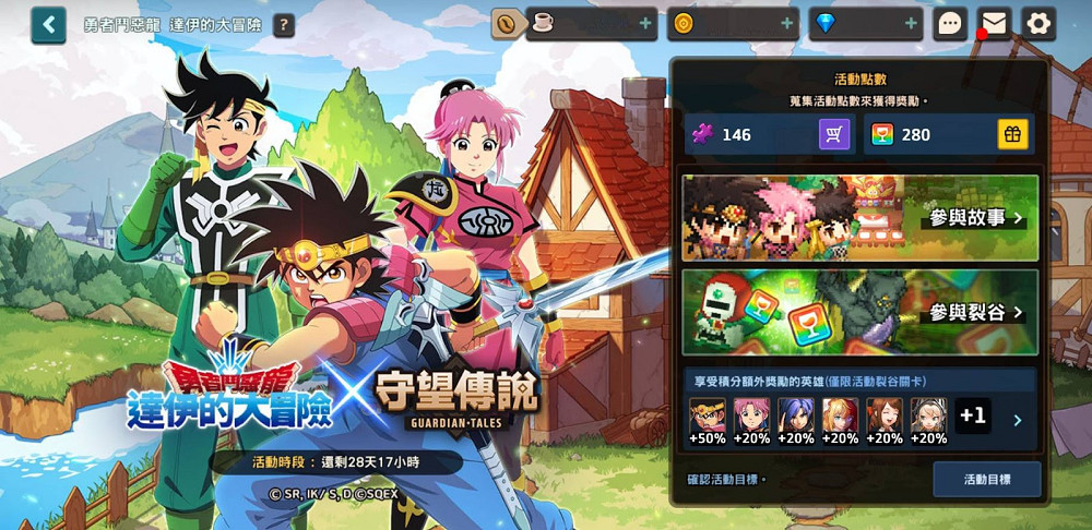 與此同時,搭配本次合作舉辦的「限時活動」中,將包含新英雄「武鬥家瑪姆」與其專屬武器,和進化時需要的成長材料作為可領取的活動獎勵之外,在「英雄召喚活動」中,守護者也有機會獲得「勇者達伊」和其專屬的武器!官方同步表示;「魔法師波普」也將會在下次更新的時候,被加入到第2彈的「英雄召喚活動」內容中,再請守護者們敬請期待下次改版的內容囉!