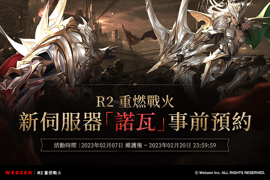 WEBZEN 自20日開始,在官方社群將進行《R2 重燃戰火》的新服「諾瓦」事前預約。參加事前預約的所有玩家,將獲得包含最上级特殊精華箱子的「事前預約特殊箱子」,可在新服使用。 2月21日即將開服的「諾瓦」,和在新服即將開啟的各種活動消息,歡迎訪問事前預約網站(https://r2m.webzen.com.tw/pre-register/nova)。