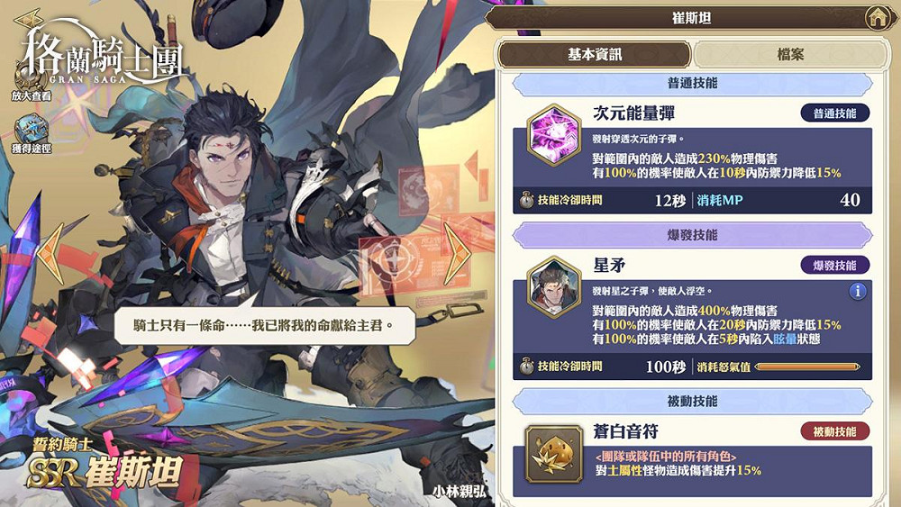 崔斯坦:娜瑪莉專屬格蘭武器,對範圍內敵人造成物理傷害,並降低敵方防禦力;被動技能是全隊成員對土屬性敵人造成傷害提升。