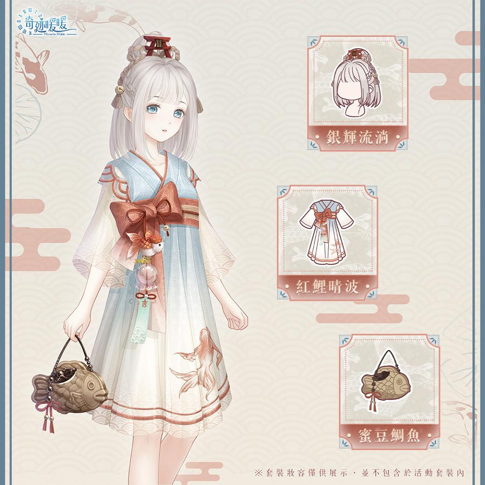 在本次活動中,每個限定部件首次獲得時,搭配師可額外獲得「喚鯉串鈴*1」;獲得重複部件時,重複部件將轉化為一定數量的「躍鯉氣泡」。搭配師使用「喚鯉串鈴」及「躍鯉氣泡」可兌換「衿袖池鱗」限定散件,包含髮型「銀輝流淌」、連衣裙「紅鯉晴波」與手持「蜜豆鯛魚」,以及鑽石、星光幣等多種獎勵!