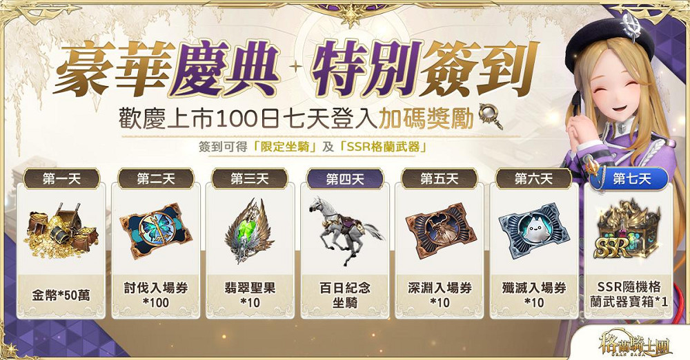 慶祝遊戲上線100天!特別開啟7天限定簽到加碼,在活動期間簽到即可獲得「百日紀念限定坐騎」及「SSR格蘭武器寶箱」等超級多的豪華獎勵哦!