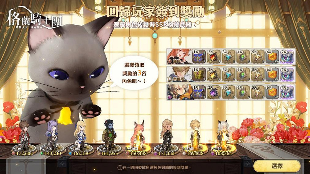 可在騎士團中選擇三名角色,獲得3個指定的回歸寶箱,累積簽到7天即可獲得角色專屬的SSR格蘭武器及大量成長材料!