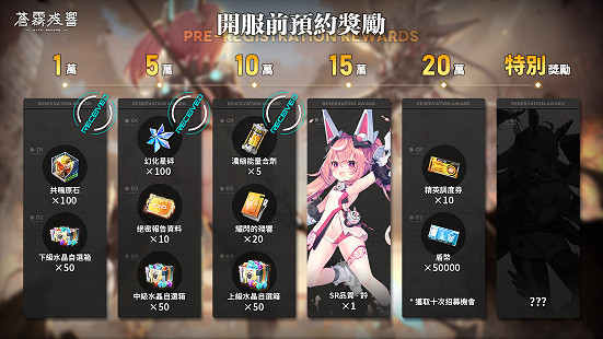 《蒼霧殘響》從3月7日正式展開事前預約迄今已超過10萬人,玩家於遊戲開服後登入遊戲即可獲得:共鳴源石*100、上級水晶自選箱*50、幻化星碎*100、絕密報告資料*10等獎勵道具。