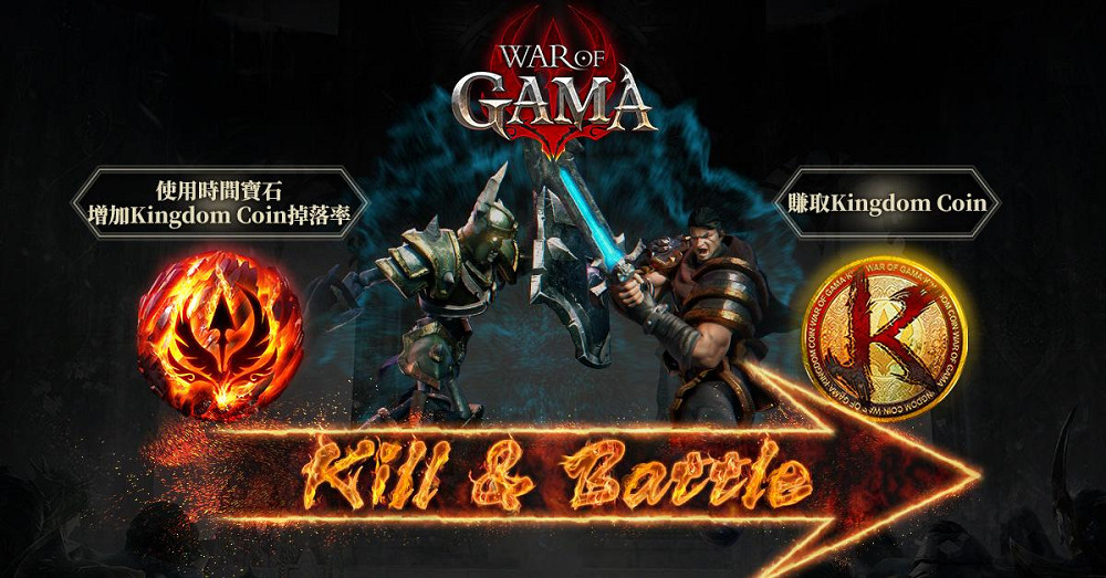 《War of GAMA》承襲經典MMORPG遊戲玩法,除有可以解放雙手的離線掛機、單手操作輕鬆暢玩的新鮮元素及提供隨機增益屬性的魔化系統外,還增加了有別於傳統遊戲鑽石、金幣的全新貨幣Kingdom Coin,此貨幣於本作中扮演著相當重要的角色,可用於洗鍊魔化系統產生的增益屬性,以取得更強更適合的屬性,還可用來強化安定值以上的裝備武器,製作及合成稀有(藍色)品質以上的變身卡和召喚靈,當需要拍賣價值1萬鑽石以上的道具寶物,也必須消耗kingdom Coin才可進行,玩家在《War of GAMA》的世界中若想要變得更強、擁有更高戰力,可以說是缺Kingdom Coin不可!而Kingdom Coin僅能透過在遊戲內打怪、擊殺BOSS或是與其他玩家PK取得,並每日有固定的獲取上限,玩家可使用特殊道具「時間寶石」來提高Kingdom Coin的取得上限及提升掉落率,根據帳號內擁有不同品質的變身卡,可使用「時間寶石」的數量有所不同,當帳號擁有紫色(傳說)品質的變身卡每日可使用三顆寶石提高獲取上限及提升500%的掉落率,紅色(英雄)品質及藍色(稀有)品質則分別可以使用兩顆及一顆寶石,使用後大大提升Kingdom Coin取得上限,藉此可讓戰力進一步爆升,強上更強。