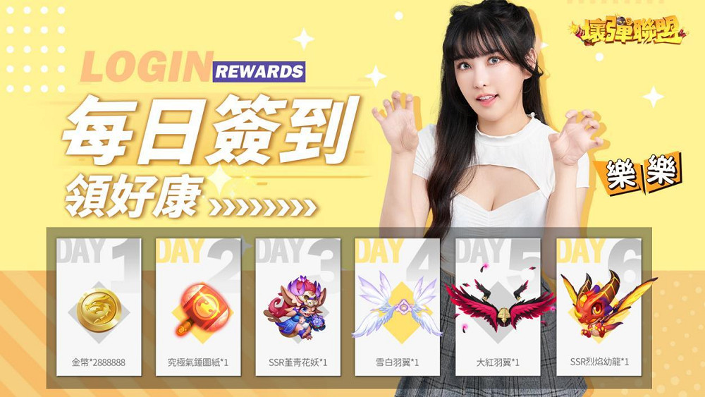 天天登入,天天領獎!《壞彈聯盟》官方為新手玩家準備了超多大獎,「SSR堇青花妖」、「SSR烈焰幼龍」、永久翅膀「雪白羽翼」、「大紅羽翼」登入就送,還有「高級武器圖紙」、「2888888金幣」領到手軟!