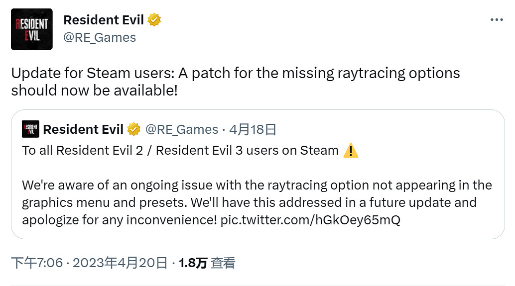 4月15號時有玩家發現卡普空移除了Steam《惡靈古堡2重製版》、《惡靈古堡3重製版》中的光線追蹤功能,4月18號官方回應稱只是暫時移除,未來會通過更新回歸。今日惡靈古堡官推表示:缺失的光線追蹤選項更新檔現已更新。 來源:遊俠網