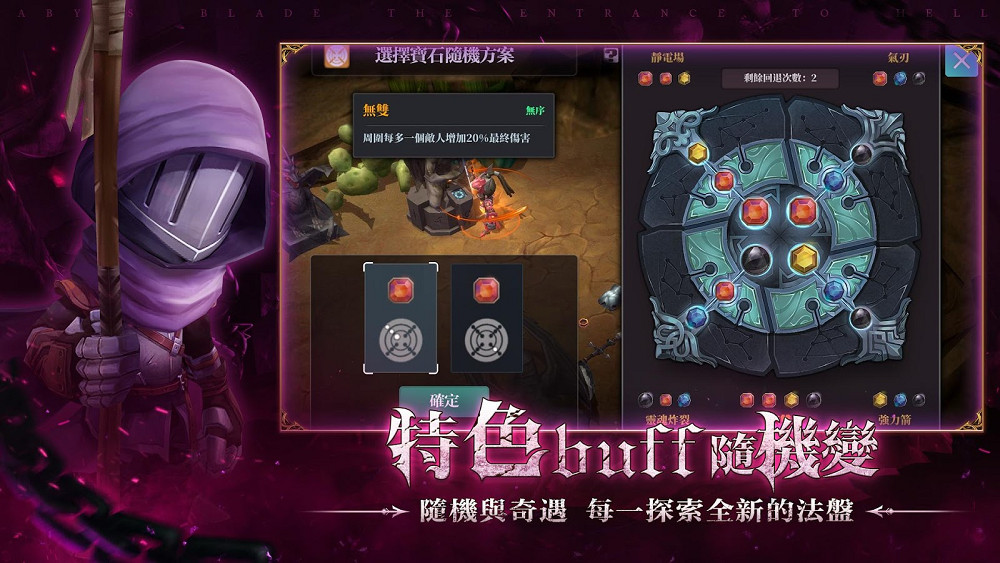 旅途中會出現各種不同的寶石祭壇,玩家獲得寶石後,搭配遊戲中獨特的「法盤系統」,讓你在對戰中隨機變強。透過法盤能創造出不同的屬性技能與獨特的能力,每次探險都有著不可測的玩法,千變萬化的Buff組合給你滿滿驚喜,怎樣都玩不膩。