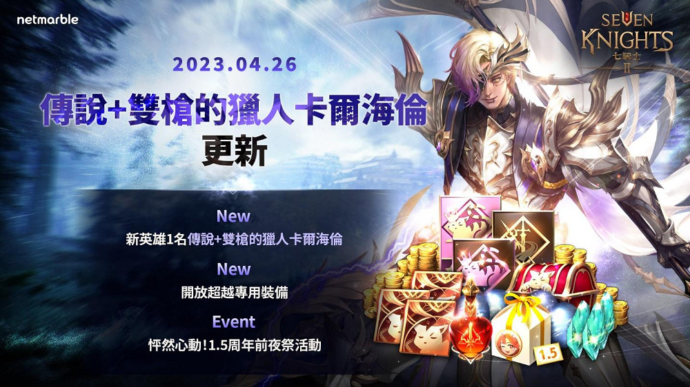 傳說+「雙槍的獵人卡爾海倫」成長活動(4月26日至5月10日):自等級36級開始,玩家每提升2級可以獲得多種成長全新英雄「卡爾海倫」所需的各種道具,包含金幣、「1.5周年前夜祭硬幣」、「卡爾海倫靈魂石」、「神話靈藥」與「萬能型靈魂石碎片」。