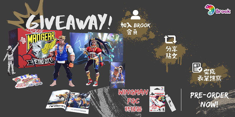即日起至6月19日止,只要完成「加入Brook會員」、「分享貼文」及「表單填寫」三個步驟,就有機會獲得《快打旋風 6》Mad Gear Box限定版(價值美金249.99元),詳情請見Brook Gaming官方粉絲團